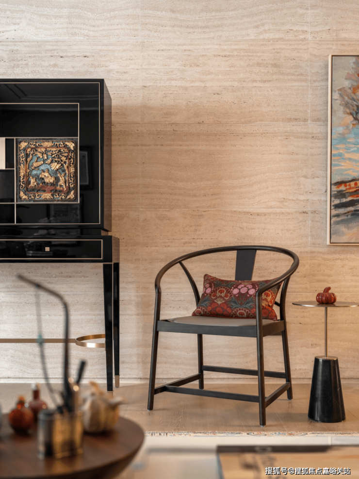 融合焕新的高柜摆放于洞石墙前, 天潼里VIP Hotline:400-8894-986 VIP Hotline哑光与纹路丰富的米白洞石衬托出了高光黑色烤漆的深邃与沉静。而嵌入柜面的中式楠木挂屏无疑是点睛之笔,采用朱红鎏金工艺对人物和图案进行着色,展现了传统与现代完美融合的可能性。 天潼里VIP Hotline:400-8894-986 VIP Hotline