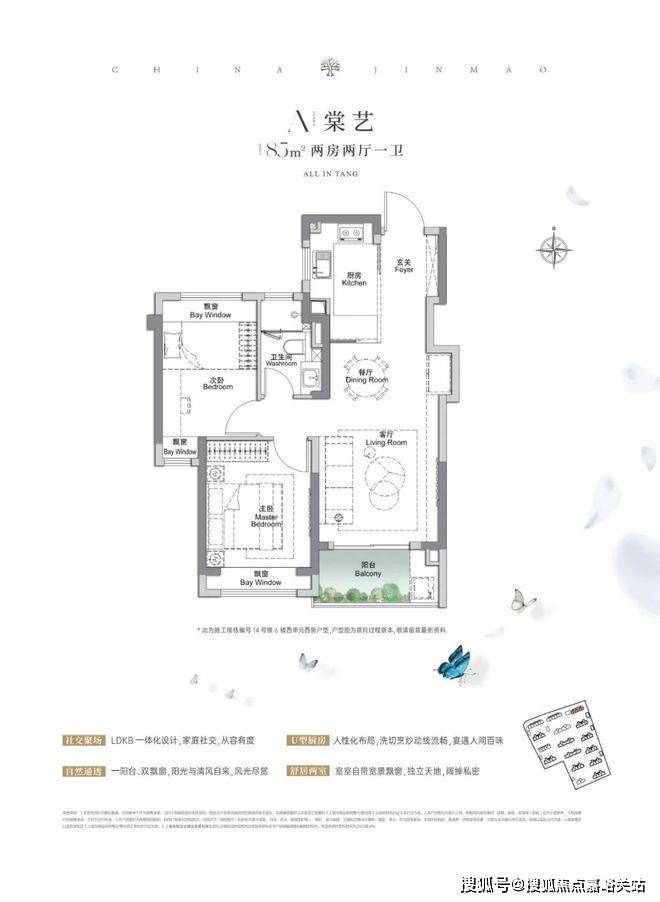 建面约85㎡2房2厅1卫,做到了双开间朝南+3个飘窗+LDKB一体化设计,附加空间非常多。