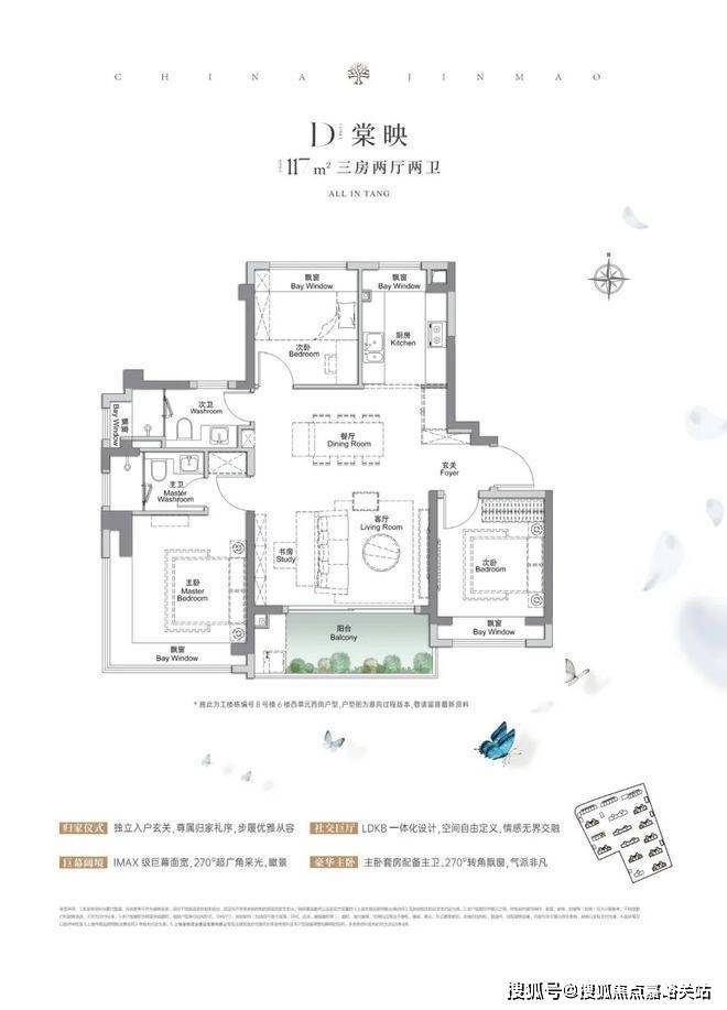 建面约117㎡3房2厅2卫,做到了3+1开间朝南5个飘窗+主卧套房设计+270°转角飘窗,所有的尺度都有进一步提升。