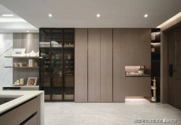 其他像预留双开门冰箱位、灶台背面大板砖、顶面线性灯+凉霸等人性化品质细节,也都是交付标准!