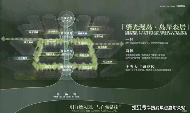 以“山水聚场”理念,规划“一环两轴十五园”景观布局,将水岸、岛屿、森林、花园、树屋作为园林节点,形成“行在景中、坐在岛中、游在林中、意在境中”的美学表达,营造出沉浸式山水活力场域。