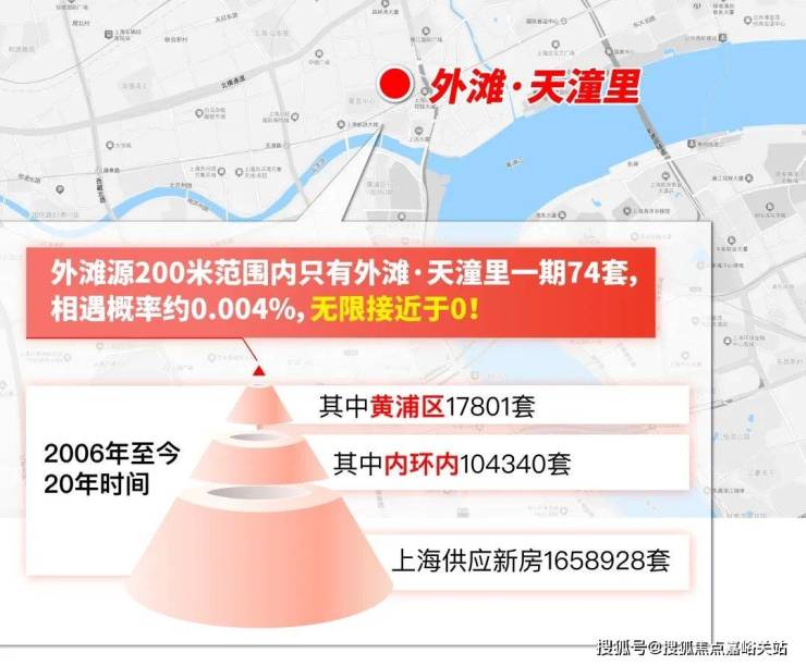 据网上房地产数据显示,2006年至今,近20年的时间全上海供应新房约166万套,其中属于内环内的有10万套,属于黄浦的有1.78万套,而在外滩源200米范围, 20年来只有外滩天潼里一期取证的74套(59套超高层+15套风貌别墅), 相遇概率仅约0.004%,无限接近于0!