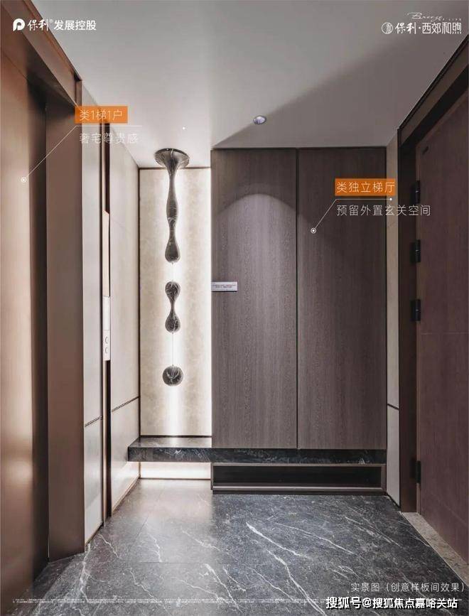保利西郊和煦最新售楼电话:4008-824-258(预约样板间),入户大堂景墙利用香槟金铝板包边,凸显优雅品质。