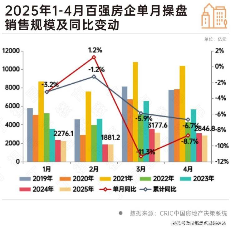 2025年1-4月,中国房地产市场整体保持低位运行,延续止跌回稳态势。4月,TOP100房企实现销售操盘金额2846.8亿元,环比降低10.4%、同比降低8.7%,单月业绩规模保持在历史低位。累计业绩来看,百强房企1-4月实现销售操盘金额10181.7亿元,同比降低6.7%。