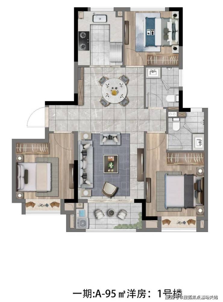 D户型 建面约96㎡ 三房两厅两卫: