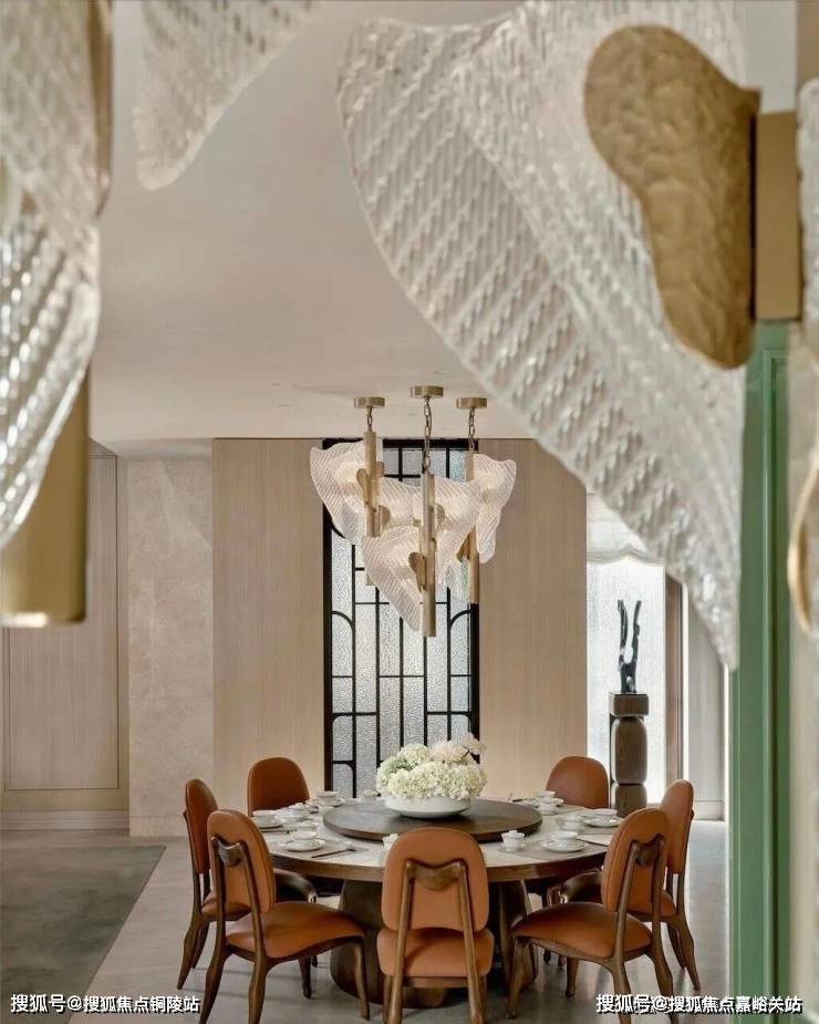 餐厅的设计巧妙融合了老上海的经典元素,圆形餐桌和橘色皮质餐椅在色彩上既现代又充满活力,顶部的水晶吊灯造型灵感来自上海市花“玉兰花”,既增添了空间的华丽感,又巧妙地融入了上海的地域特色。
