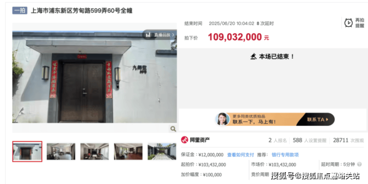 这幢建筑面积达到682平方米的独栋中式别墅拍卖共收获2.8万次围观,两名参拍者竞价9轮,最终用户姓名侯磊以最高价胜出(1.09亿元),溢价率为5.8%,成交单价约合16万元/平方米。