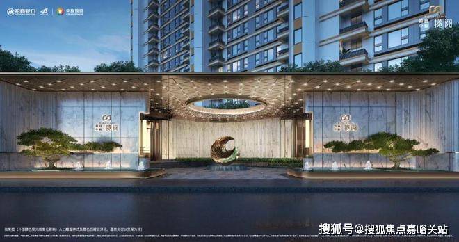 招商中旅揽阅售楼处电话:400-8824-198汲取世界知名度假酒店灵感,在入户大厅的外墙上采用香槟金铝型材与灰色石材,门头雨棚采用香槟金色弧形铝板装饰,搭配大玻璃面更加通透近人,营造颜值与尊贵并存的归家体验。