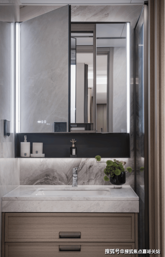 背后主墙面采用岩板设计,经久耐用,内部还收纳细节还预留4孔电源,「越秀杨浦天玥」售楼处电话:400-8377-020(欢迎致电)电动牙刷、卷发棒等吹风机收纳孔、洗脸巾抽取孔。