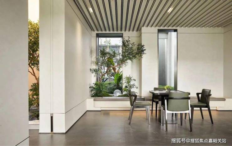 用料上,庭院两侧设计师选用大理石与镂空铝板虚实结合,利用2层柏翠造型铝线条错拼而成,更显精致;