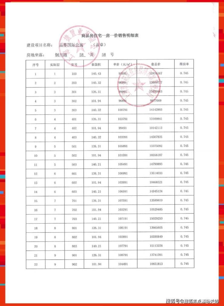 准售房源一房一价表