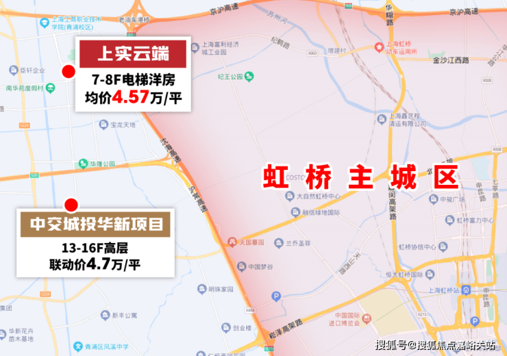 上实云端位于虹桥华新镇,属大虹桥拓展区,距离虹桥火车站约8公里,虹桥3-4公里范围内的新房均价都是6万+的,上实云端才45000/平,确实超高的性价比。