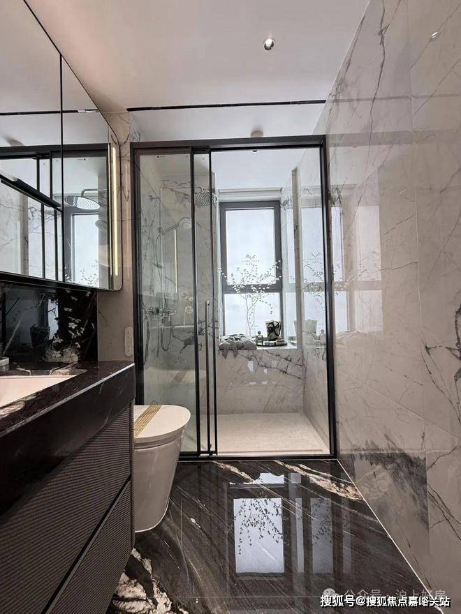 卫浴墙面采用寒江雪大瓷砖铺装,淋浴部分地面选用整块天然大理石