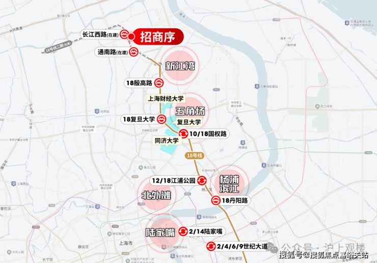 预计今年年底通车的18号线二期含金量太高了。未来从招商序所在的长江西路出发(在建)出发, 2站就是新江湾,4站财大,5站复旦,6站五角场,8站新华医院,11站杨浦滨江,12站陆家嘴滨江...并且,每站之间的距离很短,所以实际的通勤效率比想象中要更高。