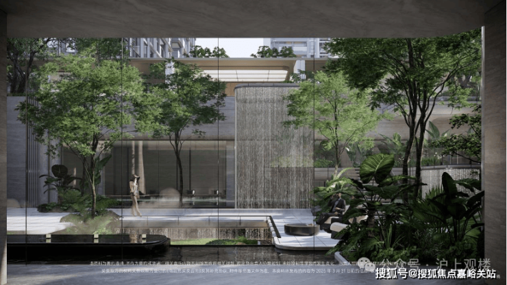 运用室内手法室外化设计构想,将垂直景墙、悬浮观景台与叠水景观立体穿插,形成情随境转的沉浸式体验,自然元素渗透进室内,并与室内空间动态互动。