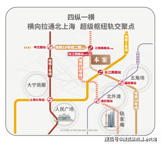 地铁18号线横向拉通了原本纵向不相连的四线地铁:1/3/18/19,将北上海横向联通,成为区域轨交的交汇聚点;项目紧邻长江西路地铁站(直线距离约150米),1站江杨南路,5站复旦,7站五角场。