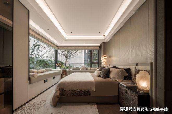 主卧套房设计,皮革造型的床背景墙也是交付标准,台盆为唯宝(或同等档次)、龙头则为科勒(或同等档次)复古龙头,马桶为高仪智能马桶(或同等档次)。海上清和玺售楼处电话☎:400-833-6309(预约热线)✔✔✔
