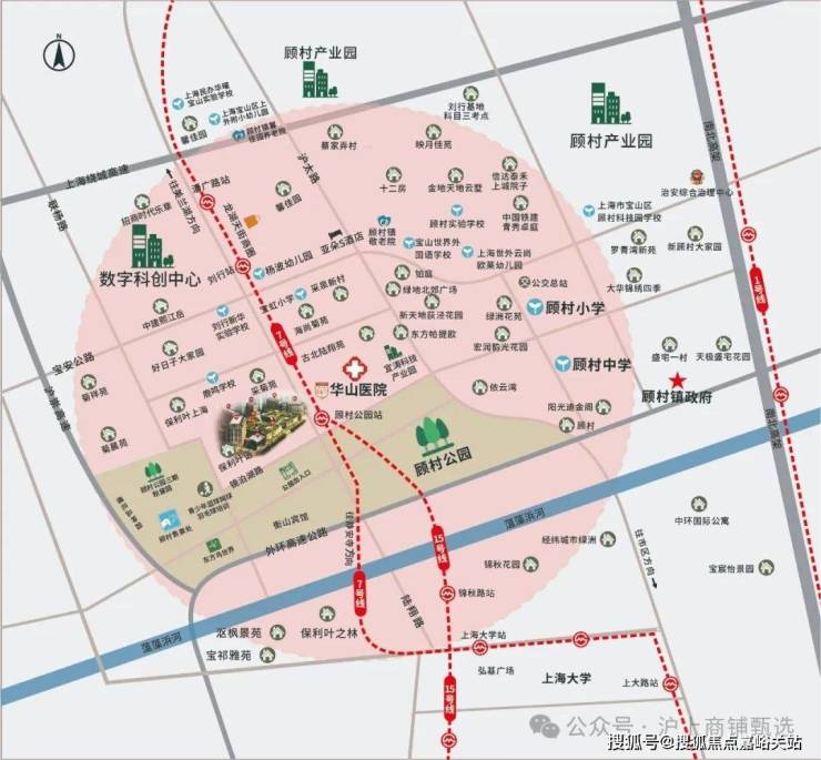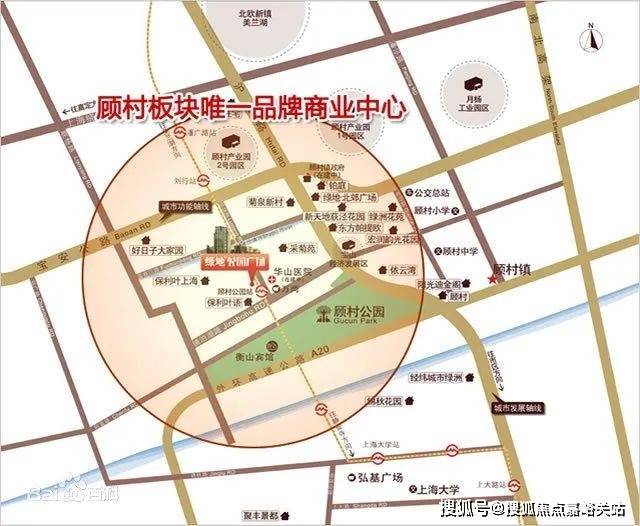 顾村公园、华山医院、绿地公园广场、环公园豪宅大型居住社区、上海大学、科技产业园