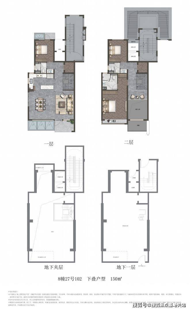 150㎡下叠:下叠地下室层高约5.65米,首层约3.15米,二层3.15米,首层约7.2米横厅连接南向花园+北房间+1厨1卫;二层南向主卧套房+北次卧+家庭共享空间,部分区域为客厅挑空,可改为房间,具有潜在的附赠面积。