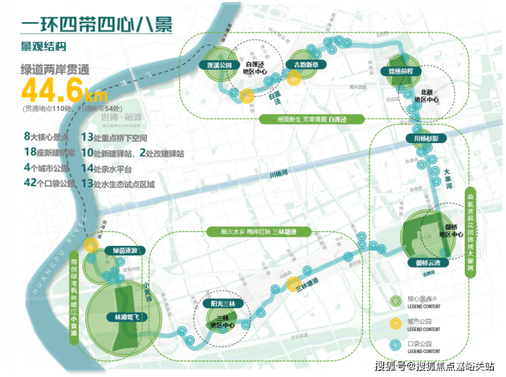 生态上,北蔡城市更新项目依托吕家浜衔接世博水环,将锦绣文化公园、图书馆等文化设施与未来地区综合商业中心有机串联,形成“公园+”地区中心,促进“两河三岸”联动。