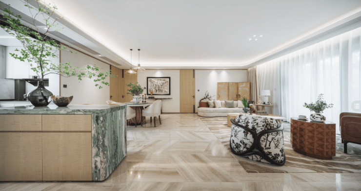 建面约193㎡户型在此基础上做了升级——美诺双开门冰箱、美诺蒸烤一体机、美诺洗碗机,餐厅还有酒柜交付,客厅电视背景墙是白雪公主奢石,餐客厅地面是拼花大理石,主卧采用唯宝浴缸。