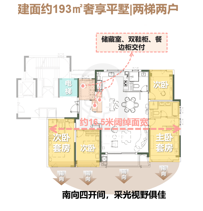 建面约133、143、193㎡户型,南向面宽分别达到了约12.2米、约12.5米、约16.5米;
