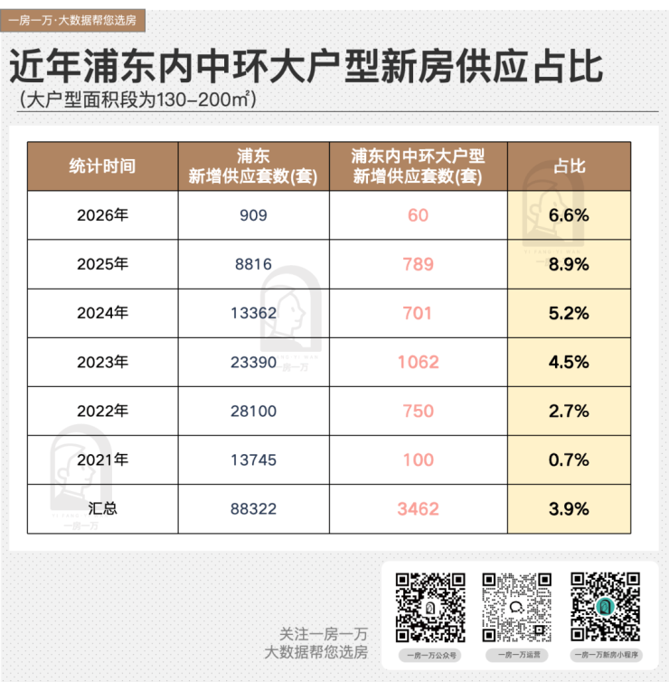 2021年至今,浦东累计供应新房约88322套。其中,内中环130-200㎡的改善大户型,只有约3462套,全区占比约3.9%。