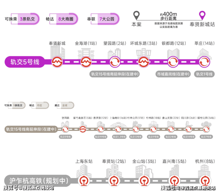 交通方面:项目多轨交环绕,5号线、15号线南延伸段(在建中)、市域嘉闵线南延伸段(规划中)、沪乍杭高铁(规划中)及南枫线(在建中)