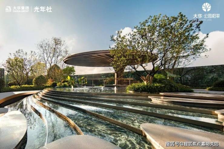 首先,大华公园柏翠利用12级叠水、2座树池、9步水上汀步,运用六重造景的手法打造近500平的中央水景!