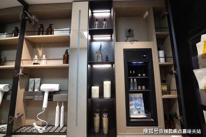 整面墙的镜柜,内部配备了美妆冰箱+门板收纳架+轨道式置物架,储物空间打造的非常充足。☑️☑️招商中旅揽阅售楼处电话:400 - 8377 - 020☑️☑️
