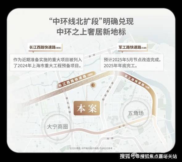 中环线北扩段明确兑现,军工路快速路25年开工,长江西路快速路列入上海市重大工程清单预备项目,快速链通城心, 随着中环线北扩段的政策明确,淞南将正式进入中环时间。未来经逸仙高架,进入南北高架、内环高架、中环高架,可快速链通南北上海;多维立体路网全面升级,未来区域价值再攀新高。