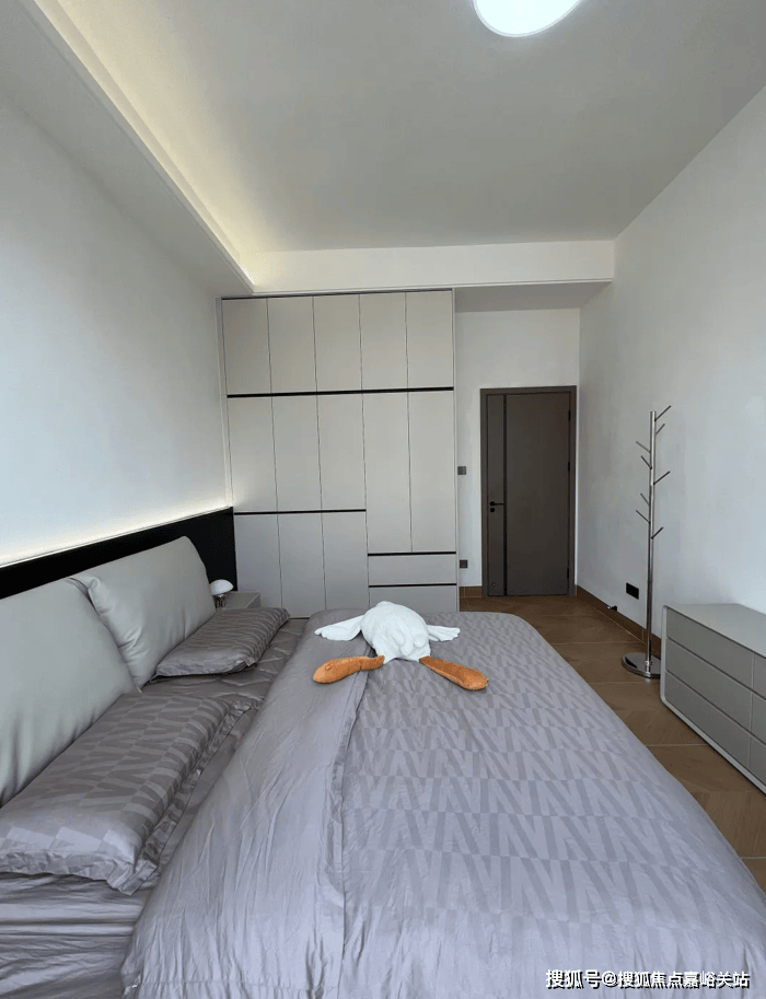 而两个儿子居住的3楼和4楼,同样也是灰地白墙,只不过吊顶局部做了暗藏灯,让空间的氛围感更好一些。