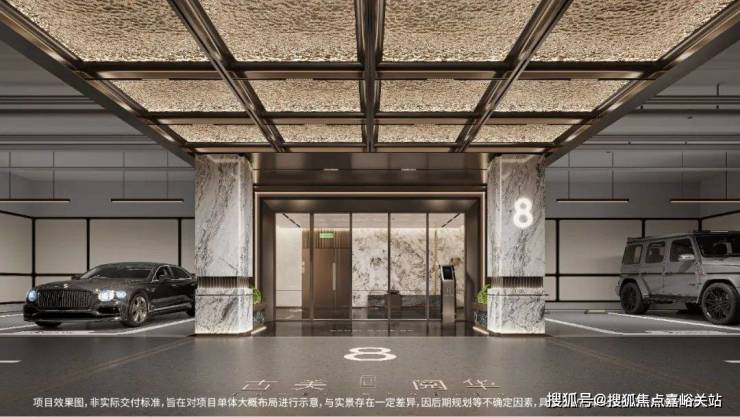 项目地库延续首层入户大堂材质高标,精选雪山银狐天然透光奢石,并以工艺难度颇高的弧度设计手法搭配金属格栅腰线营造出奢华艺术的空间感。