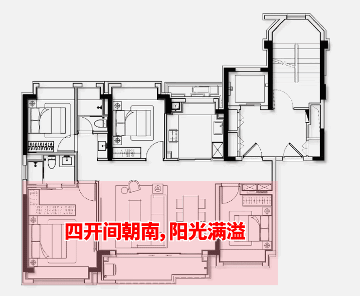 全功能主卧套房,面宽近4米;4房户型规划,让百变生活拥有更多空间搭配,满足不同阶段家庭成员功能所需。