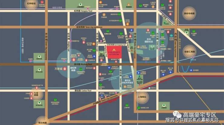 交通方面:项目地处长宁、徐汇、闵行三区交汇的金虹桥板块的核心区位,拥有多维立体的交通,延安高架、中环线、外环线环伺。临近已运行的轨交9号线合川路站、10号线龙溪路站,规划待建的25号线虹桥镇站,三站可达徐家汇。