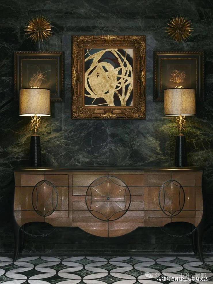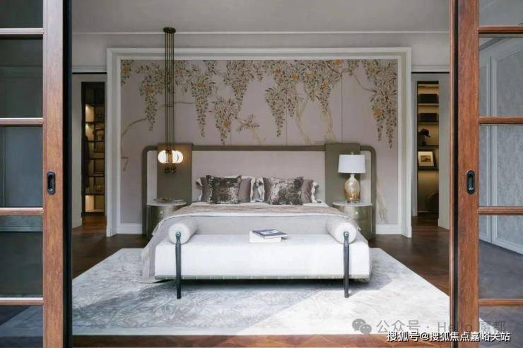 建筑面积约495㎡传家大宅,海派气质内外辉映;深色木饰面与柔和的刺绣主背景,框定空间层次格局,营造稳当厚重的氛围基调,法式留白的墙面与顶部造型,与原筑提取的典型拼花地砖相呼应,经典的精致与典雅,海派传家大宅的气度不言而明。