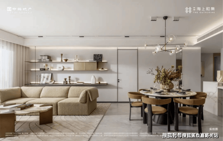 近50㎡的超大客餐厅,可以轻松容纳下岛台、中式大圆桌、沙发、电器墙等生活场景,承载阅读思考、美食分享、聚会休闲、音乐趣味等多种生活功能。