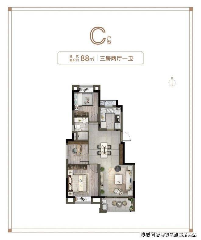 预算相对有限的,可以选这个建面约88㎡3房: