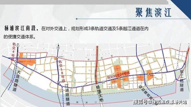 交通方面:杨浦滨江已有3轨5隧道交通格局,4/12/18号线环伺,坐拥江浦路隧道、杨浦大桥等,未来更有24、26号线规划中,交通能级领先。