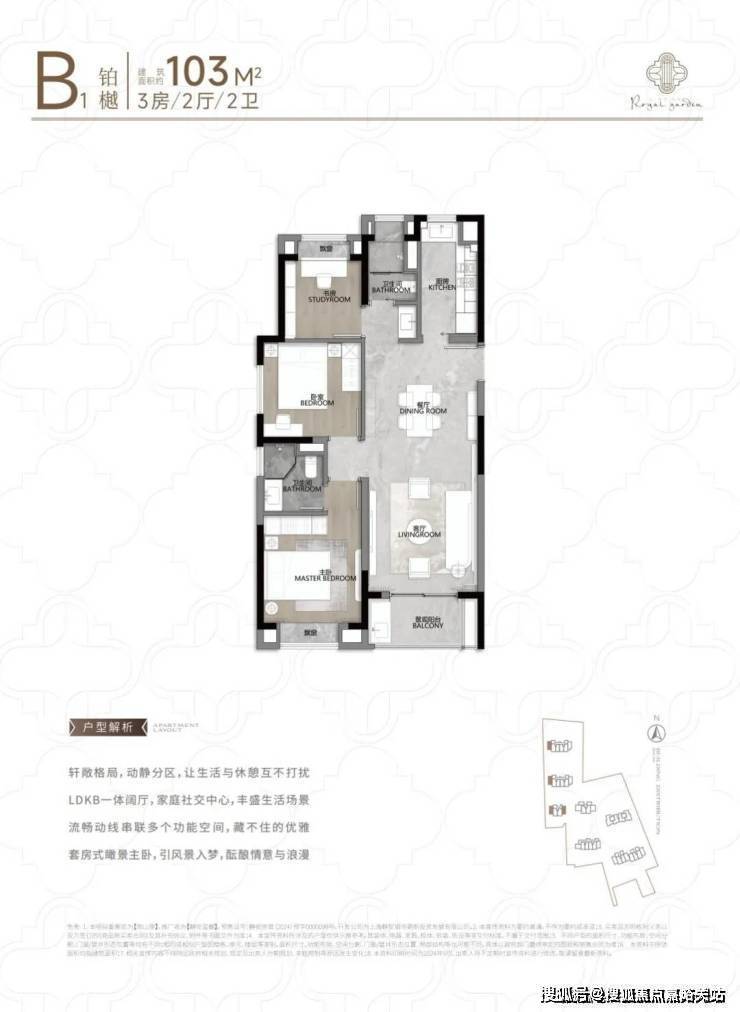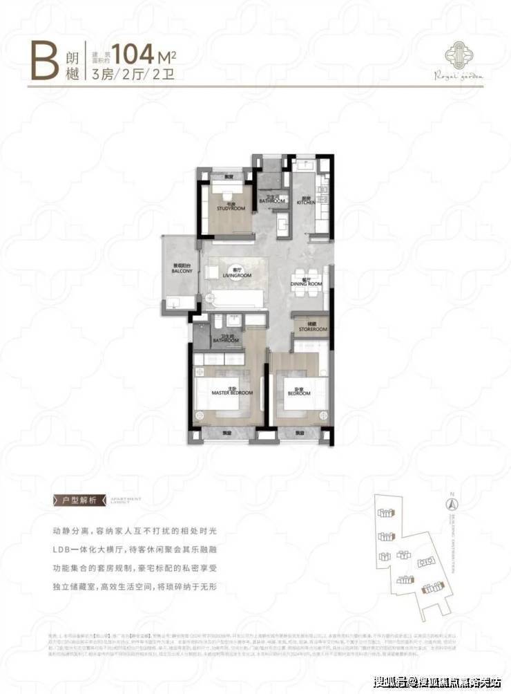 104㎡3户型特点:该户型多为楼栋的东边套,是一个观景户型。客厅连接270°阳台,视野出众。双卧朝南,阳光满溢。从次卫布局看,如果家庭人口较少,该户型还能做成双套卧。