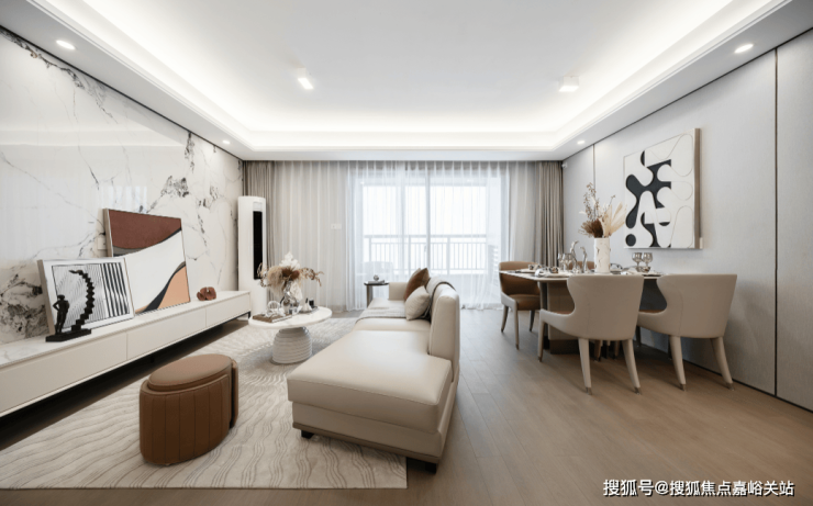一层主会客,客餐厅一体化设计,客厅开间约4.7米,连上餐厅,整个进深接近7米。