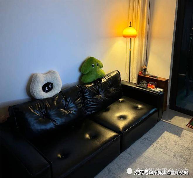 这张长沙发很有意思,黑色沙发、灰色地毯与原本的地砖和墙面就很搭不说,关键它还很舒服, 单是沙发的坐深,就占据了80公分,将近开间的一半,躺上去不会让腿半悬空。
