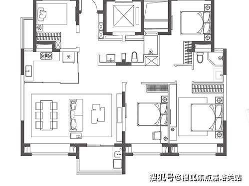 客餐厅一体化设计,连接南向观景阳台,形成约 30㎡的超大公区,空间开阔通透,无论是家庭聚会还是朋友小聚,都能从容应对。主卧套房设计,配备独立卫生间与观景飘窗,保障主人私密性与舒适度;两间次卧空间均衡,可作为儿童房、老人房或书房,满足多孩家庭与三代同堂居住需求。全明户型设计,双卫均为明卫,干湿分离,避免早高峰使用尴尬;厨房 U 型布局,洗切炒动线合理,操作高效便捷。