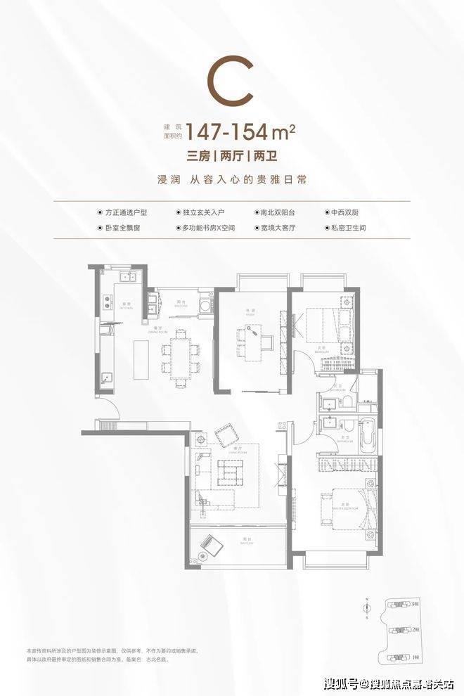 户型方面,项目主打建筑面积约134-137㎡和约150㎡精装三房: