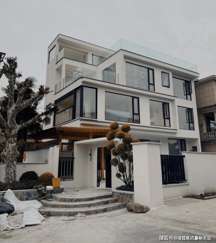 这栋自建房共有三层半,一眼望去。简约的现代造型的外观是这栋房子最引人注目的特点之一。