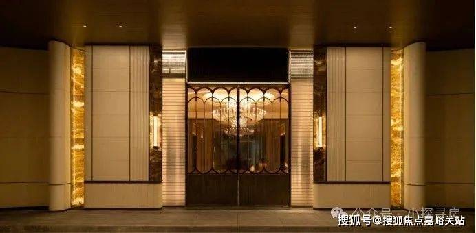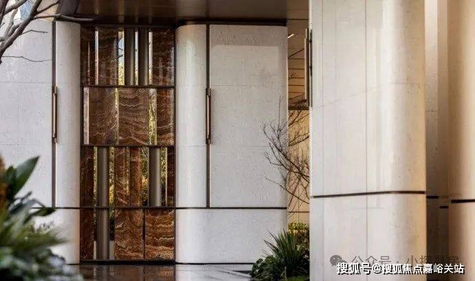 6、 社区含“奢材”量很高。门庭延街的外立面,以精工定制弧形 米色石材为主调,镶嵌典藏级 老虎玉大理石,点缀 古铜色现代海派艺术感灯器,整体呈现出百年海派的贵雅气质。