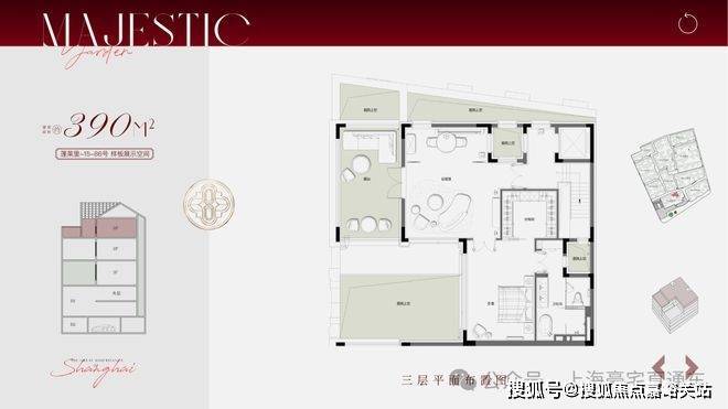 合院地上三层,面积段约210-500㎡,计合院82套。