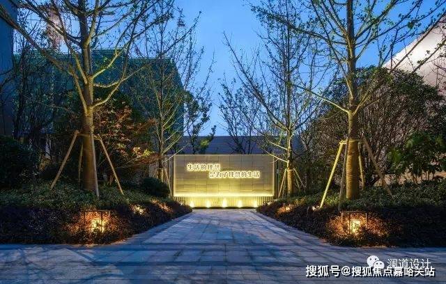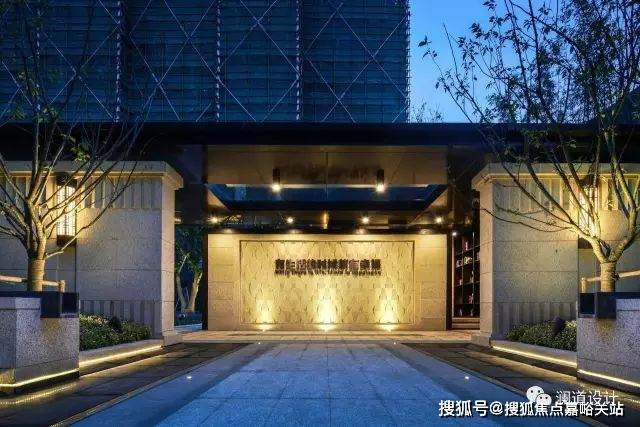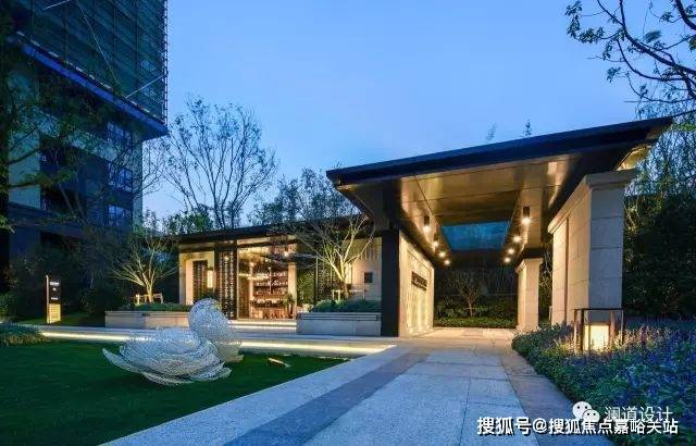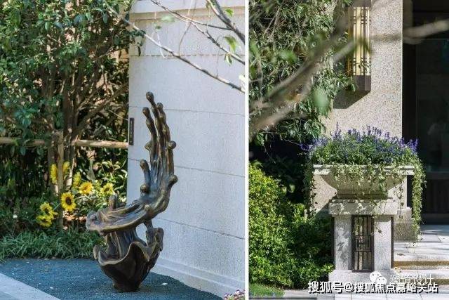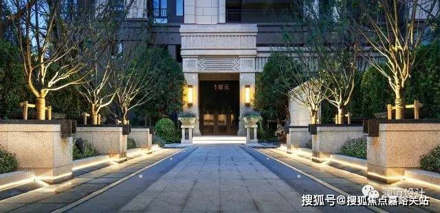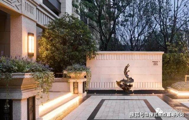单元入口花钵收头的形式、将入户平台与场地通过高差切割,入户前放置景墙、水景、雕塑,形成“质感、格调、艺术“的空间形式。