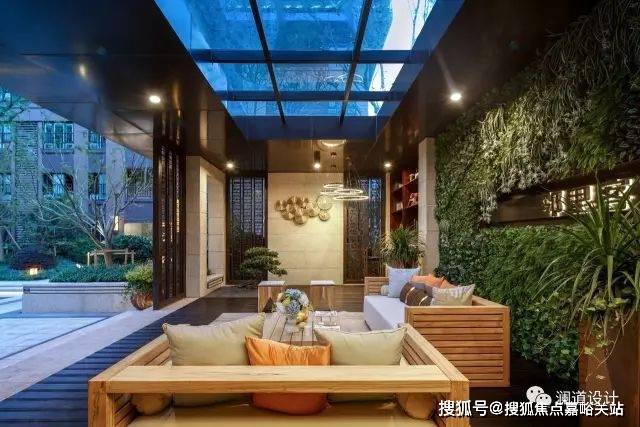 户外会客厅以廊架形式呈现,充分体现人性化、时尚化、精细化、科技化,与二进空间的门廊形成高低错落组合形式,加入金属顶板、铁艺图案、镂空墙体,形成通透、放松、若隐若现的感官效果。