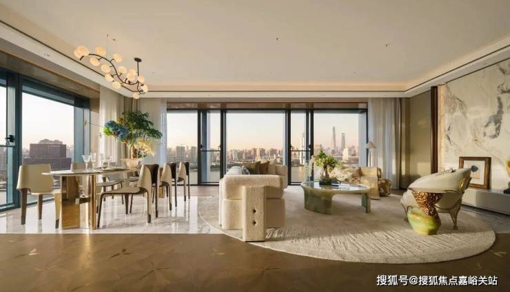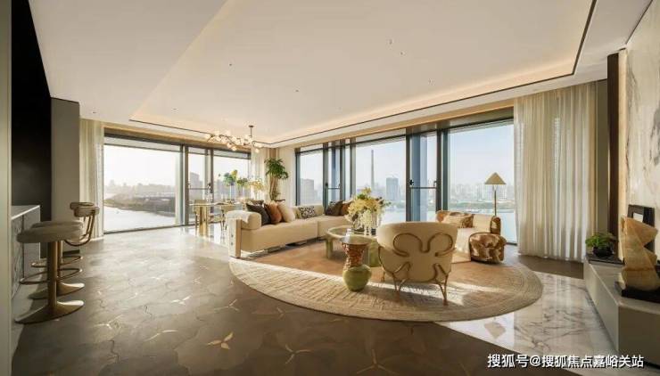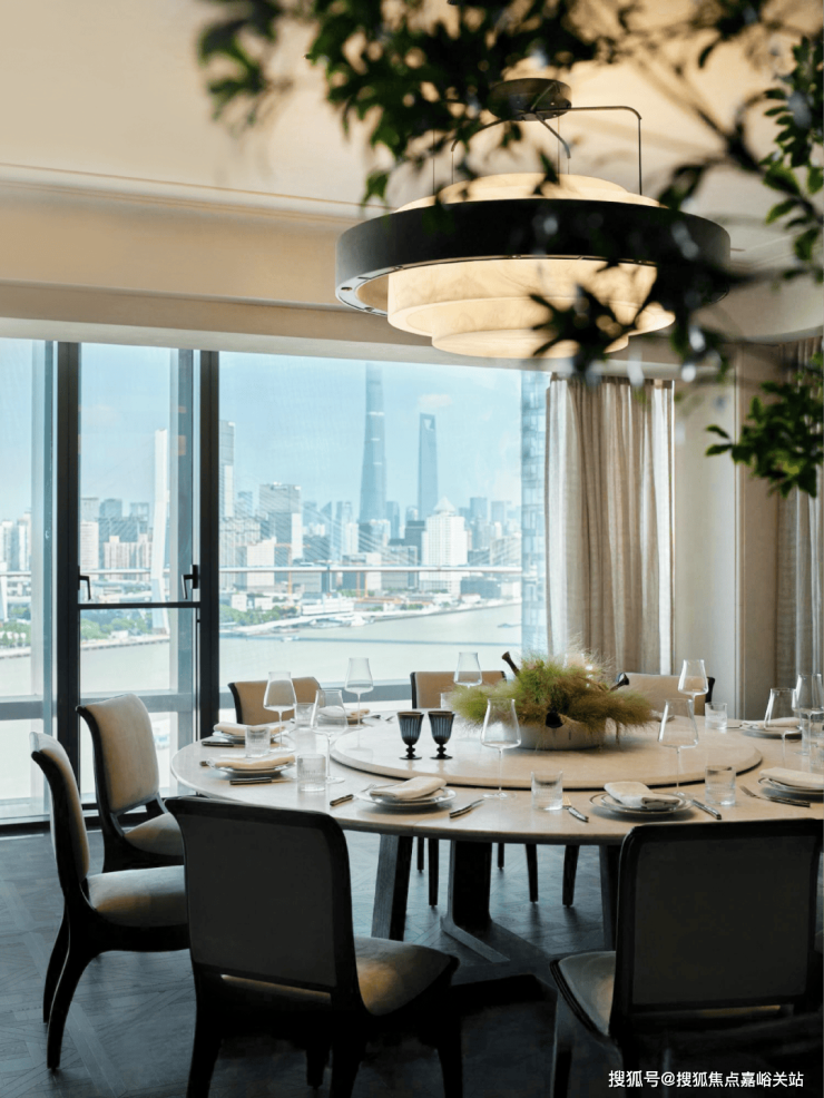 这客厅既是 270°全景舱厅 ,无论全家在餐桌前欢聚一堂,还是孩子们在客厅嬉戏,一抬头便是以江景和城市为主题的巨幅油画。